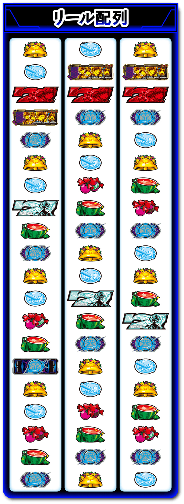 設定 CZ確率 AT確率 出玉率 1 1/175.7 1/317.8 97.7% 2 1/172.6 1/311.8 98.9% 3 1/168.5 1/304.4 100.3% 4 1/156.6 1/272.4 105.4% 5 1/145.7 1/248.1 110.0% 6 1/137.5 1/235.3 112.9% - リール配列